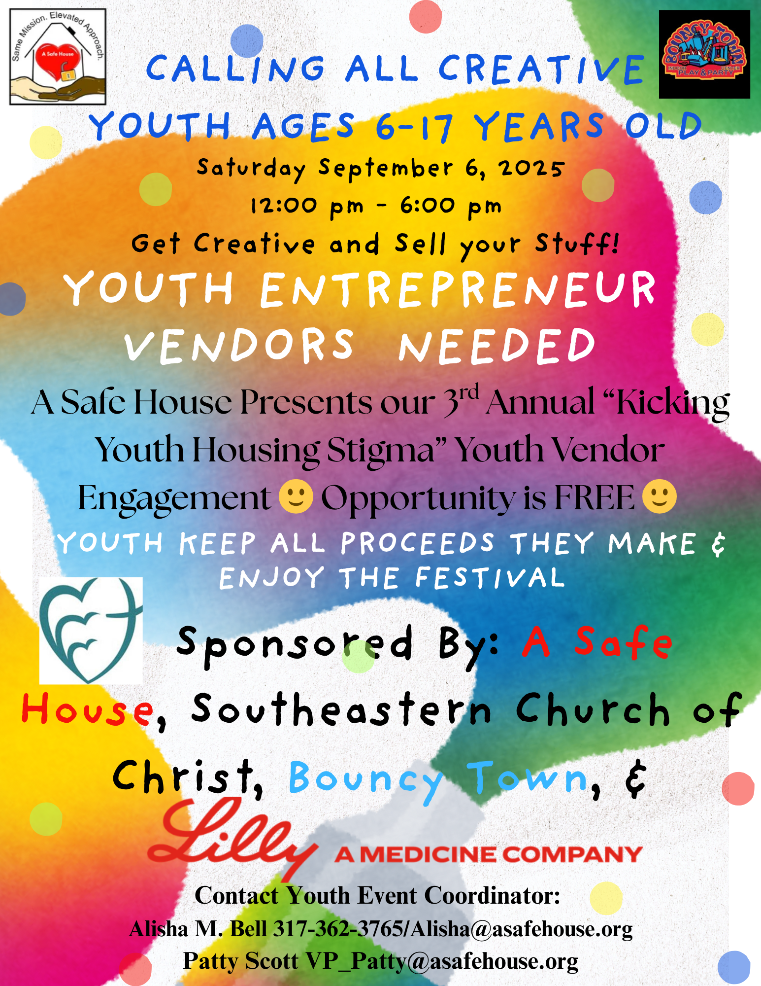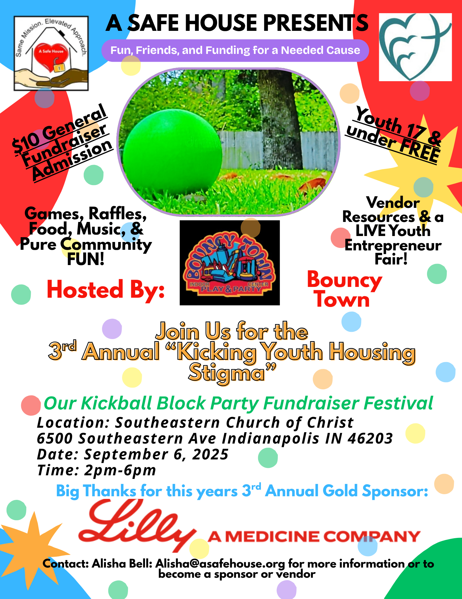 Hosted by A Safe House, Bouncy Town, and the Southeastern Church of Christ the "Kicking Youth Housing Stigma" Kickball Block Party Festival is an annual fundraiser and community celebration focused on empowering youth and individuals addressing housing insecurity, workforce barriers, post secondary educational experience support, and mental and behavioral health navigation and services. Held each Year the event brings together families, friends, local organizations, and newly added youth entrepreneurs, for an afternoon of kickball, live entertainment, Free Barbeque, food vendors, Raffles, and interactive activities. All proceeds support A Safe House’s mission to provide organizational and administrative support, housing collaboration and stabilization efforts, mental health resources, and economic mobility programs for youth across Marion County (Region 12).